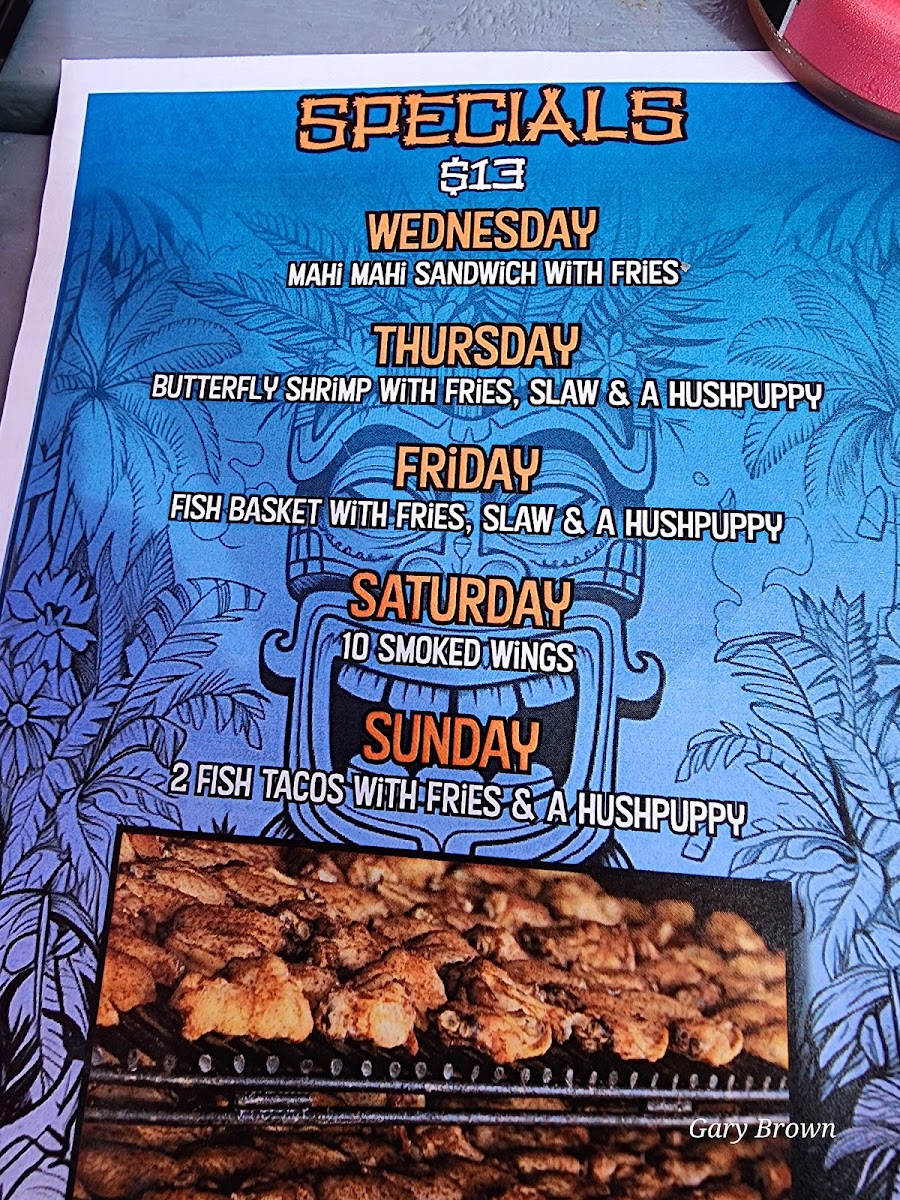 “ Pleasant surprise looking for a bite on the way back from the beach. Had the blackened fish tacos, burger, chicken tenders, with fries and hush puppies. Everything cooked well, I especially enjoyed the tacos, well-seasoned. It was an extra treat to watch the fisherman come back in with their catches and feed the pelicans the scraps ”